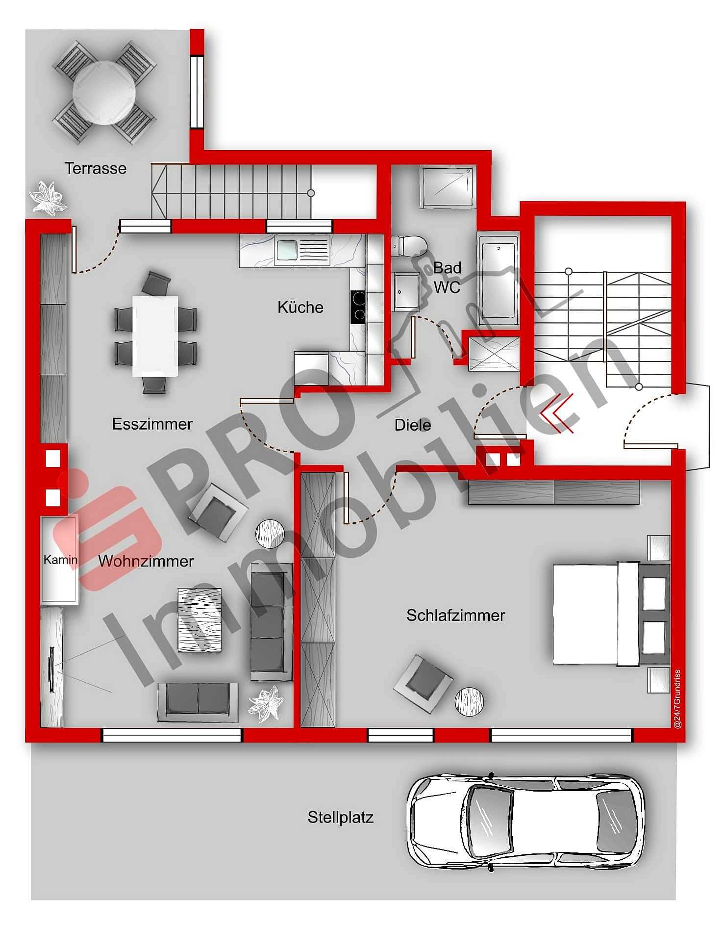 Die Wohnfläche von ca. 100 m² teilt sich wie folgt auf: Diele, Wohn-/Esszimmer mit Küche, Schlafzimmer, Badezimmer, Arbeitszimmer (im Kellergeschoss), Terrasse